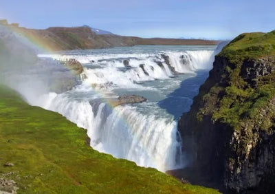 黃金瀑布是冰島最著名瀑布之一,位於黃金圈線路上。瀑布分兩層跌落,水勢壯觀。陽光下